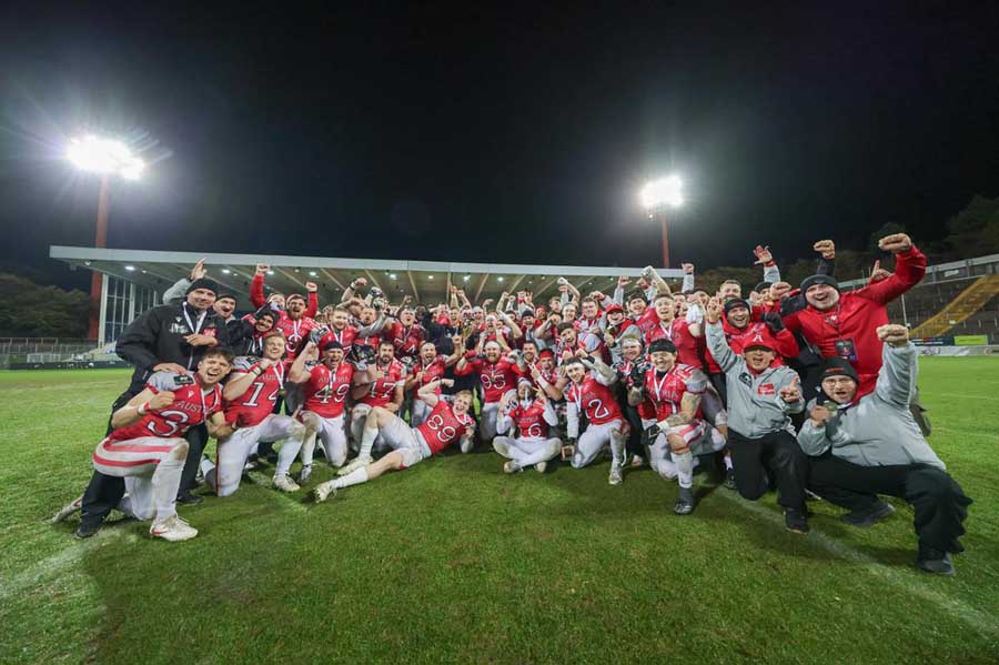 Danach verwaltete das Team von Head Coach Max Sommer die Führung souverän, erhöhte kurz vor Schluss durch einen Touchdown von Nico Hrouda auf WR Fabian Eder noch auf 27:0 und jubelte mit einer Victory Formation sowie einer Gatorade-Dusche für Head Coach Sommer über den zweiten Europameistertitel!