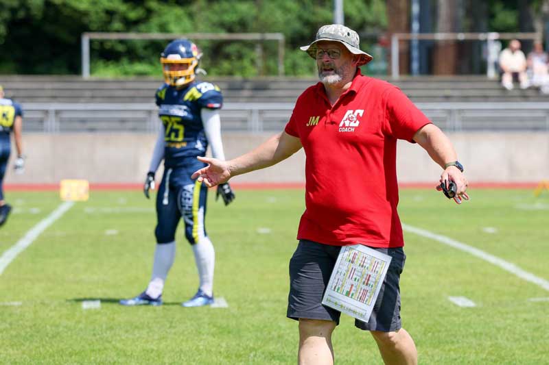 Coach „Mac“ hatte vor der Sommerpause bei seiner Feuertaufe Pech, dass das Heimspiel gegen die höher eingestuften Solingen Paladins trotz beherzter Leistung und zwischenzeitlicher Führung auch aufgrund von Verletzungen unglücklich mit 21:22 verloren ging.