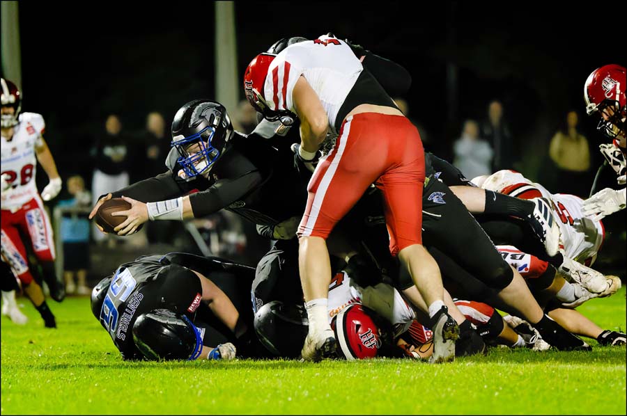 Es war eine Explosion der Emotionen, wie ihn dieser Verein in zehn Jahren noch nicht gesehen hat. Trainer, Spieler, U20, U16 - alle vereint in einer Jubeltraube auf dem Platz. Gerade hatte man das erste Heimspiel der Saison 2025 für sich entscheiden können. Dabei reicht diese Beschreibung aber bei weitem nicht aus - es war ein Drama, es war ein Krimi. Es ist wahrscheinlich jetzt schon das größte Spiel in der bisherigen Vereinsgeschichte. Dabei schlich sich zu Beginn der Partie eine trügerische Komfortabilität ein. Nach Touchdown-Pässen von Quarterback Liam Müller auf Hendrik Schwarz und Aaron Seward, führten die Kurstädter kurz vor der Pause mit 14:0 und waren außerdem im Ballbesitz. Doch erst ein Fumble und im Drive darauf ein Pick-Six brachten den Gast aus Marburg innerhalb von zwei Minuten zurück ins Spiel. Plötzlich stand es 14:14 zur Pause und das Momentum war auf Seiten der Mercenaries. Im dritten Quarter dann aber die Antwort der Gastgeber. Liam Müller zu Fuß und der anschließende Extrapunkt sorgten wieder für eine Sieben-Punkte Führung. Doch Marburg fand erneut eine Antwort und glich noch im dritten Quarter aus. Der Schlagabtausch beider Angriffsreihen fand kein Ende - Müller auf Hendrik Schwarz und der avancierte mit seinem zweiten Touchdown des Tages zum potentiellen Matchwinner. Aber das Team von Head Coach Jimmy Yock Jr. hatte auch dieses Mal einen entsprechenden Drive in der Hinterhand - Ausgleich und Overtime. Die erste für die Sentinels und es sollte eine unvergessliche werden. Zunächst Marburg mit der Chance zur Führung, doch das Field Goal ging neben die Stangen. Danach die Sentinels mit der Chance zum Sieg, doch auch hier scheitert der Field Goal Versuch. In der zweiten Overtime startete Bad Homburg im Angriff. Aufgrund vieler Verletzungen war Quarterback Timm Mielech drin, der den Ball an Linebacker Leon Wörner übergab, der sich mit einem Kraftakt bis an die drei Yard-Linie kämpfte. Von da war es Mielech selbst mit dem Quarterback Sneak und der Führung- Die anschließende Two Point war ebenfalls gut - Mielech auf Schwarz: 36:28. Marburg dann unter Zugzwang. Einige Läufe, vollendet durch einen Pass in die Endzone - Touchdown Marburg. Die anschließende Two-Point Conversion war dann der Klimax dieser Partie. Ballübergabe an den Runningback, der eine Lücke findet, aber diese stopft Linebacker Christian Holmes und bringt den Ballträger an der 1-Yard Linie zu Boden. Abpfiff.