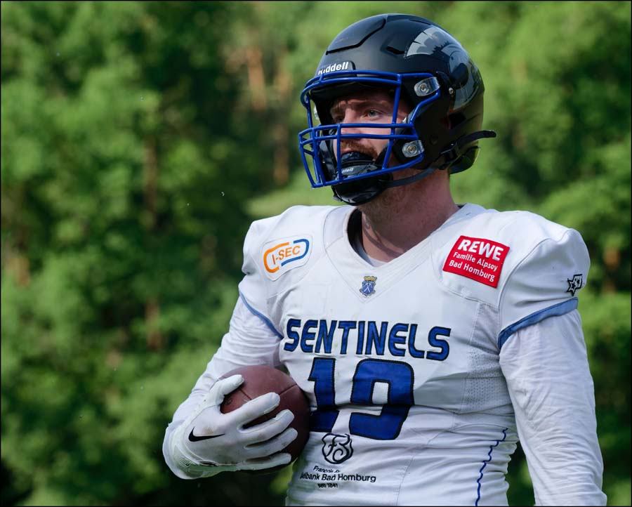 Auf beiden Seiten hatte man mit einigen Ausfällen zu kämpfen. Der Unterschied war, dass die Sentinels trotzdem mit 45 Spielern in die Pfalz gereist waren, während der Gastgeber mit 24 Spielern antreten musste. Entsprechend ist auch die Geschichte zum Spiel schnell erzählt. Bereits nach dem ersten Quarter stand es 21:0. Touchdown-Läufe durch Runningback Kai Wyrwal und ein Pass in die Endzone von Liam Müller auf Hendrik Schwarz sorgten früh für klare Verhältnisse. Die Defense überzeugte ebenfalls mit Turnover durch Adrian Deschner und Rashad Greene, der als einziger der vier Amerikaner aktiv war. In den zweiten 12 Minuten dann das selbe Bild. Spielmacher Müller auf Kevin Klemm, Runningback Amine Akrouni und erneut der Pass auf Schwarz, erhöhten noch vor der Pause auf 42:0 - mit erfolgreichen Extrapunkten durch Jamie McCulley. Die Verteidigung steuerte eine weitere Interception durch Christian Wombacher bei.