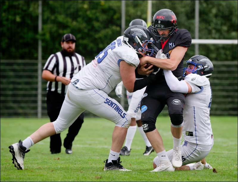 Gegen Fulda brauchte das Team von Head Coach Connor Shannon ein wenig, bis man in die Partie fand. So ging zunächst der Gastgeber in Führung, doch der Angriff um Quarterback Liam Müller fand schnell eine Antwort. Müller auf Hendrik Schwarz und auch wenn dieser den Extrapunkt verpasst, stand es zu mindestens 6:6 kurz nach Beginn des zweiten Quarters. Die Verteidigung der Wächter im Anschluss mit einer Interception und diese Vorlage nutzte am Ende erneut die Kombination Müller auf Schwarz - dieses Mal mit erfolgreichen Extrapunkt. Kurz vor der Pause dann ein Big Play von Wide Receiver Kevin Klemm, der nach einem kurzen Pass den Ball für 65 Yards in die Endzone tragen konnte. Diese zunächst etwas beruhigende Führung nahm man dann mit in die zweite Halbzeit. im dritten Quarter neutralisierten sich beide Teams größtenteils, so dass es ohne weitere Punkte in das letzte Viertel ging. Ein Fumble der Sentinels-Offense, brachte die Saints in aussichtsreiche Feldposition und man erzielte durch die Luft den nächsten Score. Zum zweiten Mal scheiterte aber die Two-Point Conversion. Bad Homburg im Anschluss nicht mit einem Touchdown, aber einem erfolgreichen Field Goal durch Schwarz, so dass man den Vorsprung auf "Two Scores" ausbauen konnte. Diesen Rückstand konnte Fulda trotz großer Bemühungen nicht mehr aufholen.
