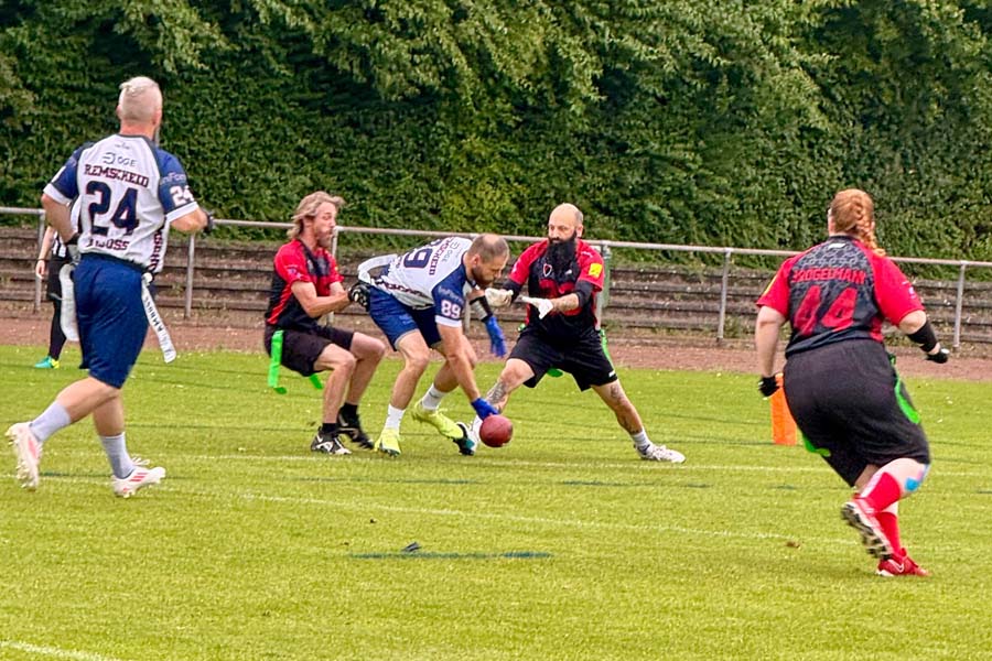 Die abschließende Begegnung gegen den gastgebenden Ligaprimus aus Neuss hatte somit nur noch statistischen Wert. Der weiter anhaltende Regen sorgte für viele kuriose Aktionen auf beiden Seiten. Neuss hatte letztendlich das Quäntchen Glück mehr auf seiner Seite und konnte nach 40 gespielten Minuten einen 25:13-Erfolg für sich verbuchen. Dem Jubel der Solinger tat dies unterdessen keinen Abbruch.