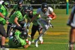 Black Barons unterliegen den Lippstadt Eagles In der Verbandsliga Ost kam es zu der Begegnung zwischen den Herne Black Barons und den Lippstadt Eagles. Bestes Wetter begleitete das Spiel im Horststadion vor rund 150 Zuschauern. Schon im ersten Drive kämpften sich die Eagles in die Endzone der Barons und setzen die ersten Punkte auf die Anzeigetafel. Bis zur Halbzeit bauten die Gäste aus Lippstadt ihre Führung mit 20 zu Null aus. Dabei konnten sich die Barons immer wieder in Richtung gegnerische Endzone kämpfen, doch jedes Mal, wenn sie vor der Endzone standen, gab die Eagles Defense noch einmal alles und konnte den Ball für sich erobern. Erst zum Ende des dritten Viertels holten die Barons ihre ersten Punkte durch einen Safety. Traurige Bilanz eines emotionsgeladenen Spiels: unzählige und unnötige Flaggen. Drei Spieler wurden vom Platz gestellt - zwei Lippstädter wegen unsportlichem Verhalten und Targeting, ein Herne Spieler ebenfalls wegen Targeting. Viertelergebnisse: 0:13 / 0:7 / 2:6 / 0:13 Endstand: 2:39 |