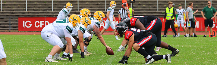Derbytime bei den GFL Juniors in Düsseldorf Düsseldorf Panther empfangen die Cologne Crocodiles Das ewige Derby zwischen Düsseldorf und Köln ging an diesem Wochenende in die nächste Runde. Gut 200 Football Fans wollten das U19 Spiel zwischen Panther und Krokodile sehen. Natürlich wollte das Team aus der Domstadt das bisher ungeschlagene Team aus der Landeshauptstadt die Suppe versalzen und das Spiel für sich entscheiden. Doch die Panther ließen gerade mal einen Touchdown für die Crocodiles zu. Viele Fehler und auch zu viele Strafen beherrschten das Spielgeschehen. Dennoch war die Dominanz der Düsseldorfer nicht zu übersehen. Mit 5 Touchdowns und guten PATs, sowie einem Field Goal und einem Safety entschieden die Düsseldorf Panther das Spiel für sich. Viertelergebnisse: 10:0 / 16:0 / 14:6 / 0:0 Endstand: 40:6 |