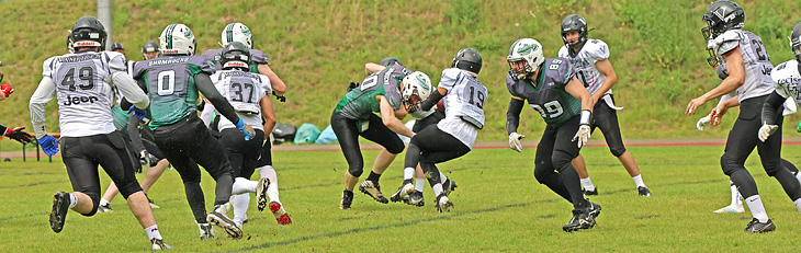 Regenschlacht im Wenderdome: Mülheim Shamrocks unterliegen Aachen Vampires Vor rund 100 Zuschauern lieferten sich die Mülheim Shamrocks und die Aachen Vampires eine wahre Abwehrschlacht - und das bei denkbar schwierigsten Bedingungen. Pünktlich zum Einlauf der Gastgeber öffnete der Himmel seine Schleusen, und ein Platzregen verwandelte das Spielfeld im "Wenderdome" in eine Rutschbahn. Mal prasselte das Wasser unaufhörlich, mal ließ der Regen nach - im dritten Viertel blinzelte sogar kurz die Sonne durch die Wolkendecke. Doch der tief aufgeweichte Rasen blieb eine Herausforderung für beide Teams. Das Spiel begann zäh, geprägt von starken Defensivleistungen auf beiden Seiten. Keine Mannschaft konnte sich entscheidend durchsetzen, sodass es mit einem seltenen 0:0 in die Halbzeitpause ging. Nach dem Seitenwechsel bewiesen die Aachener dann ihre Durchschlagskraft: Sie knackten die Mülheimer Verteidigung und setzten die ersten Punkte auf die Anzeigetafel. Zwar kämpften die Shamrocks verbissen weiter und arbeiteten sich mehrfach bis in die gefährliche Zone der Gäste vor, doch die Vampires ließen nichts anbrennen. Immer wieder scheiterten die Hausherren an der gut organisierten Defensive der Gäste. Am Ende mussten die Mülheimer sich den entschlossenen Vampires geschlagen geben, die mit einem 16:0-Sieg die Heimreise antreten konnten. Eine Partie, die durch Wetterkapriolen und intensive Zweikämpfe geprägt war, aber letztlich die Gäste als verdiente Sieger hervorbrachte. Viertelergebnisse: 0:0 / 0:0 / 0:7 / 0:9 Endstand: 0:16 |